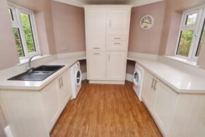 Windows to side and rear, wood effect flooring, inset spot lights, radiator, range of storage cupboards, sink drainer, space for washing machine and tumble dryer, door leading to