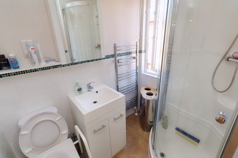 Double glazed obscured window to the side, low level W.C, wash hand unit set in vanity unit, shower cubicle, heated towel rail, half tiled walls