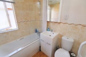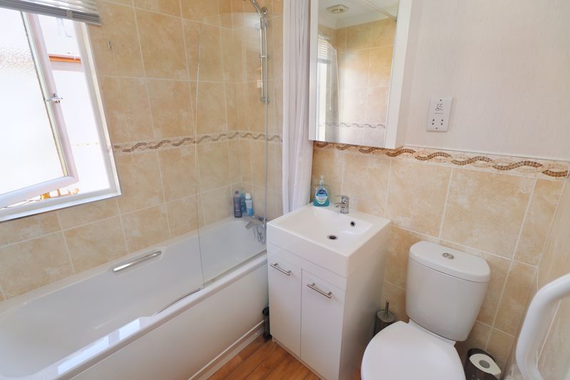Double glazed obscured window to the side aspect, heated towel rail, tiled splash-back, white suite comprising of: panelled bath, wash hand basin set in vanity unit, low level W.C