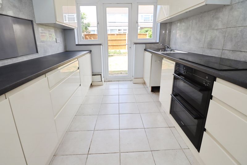 Door to garden, window to rear aspect, tiled flooring, inset spot lights. Range of contemporary wall and base units with contrasting worktop, stainless steel sink/drainer, inset electric hob with extractor over, integrated electric oven. Space for washing machine, fridge/freezer.