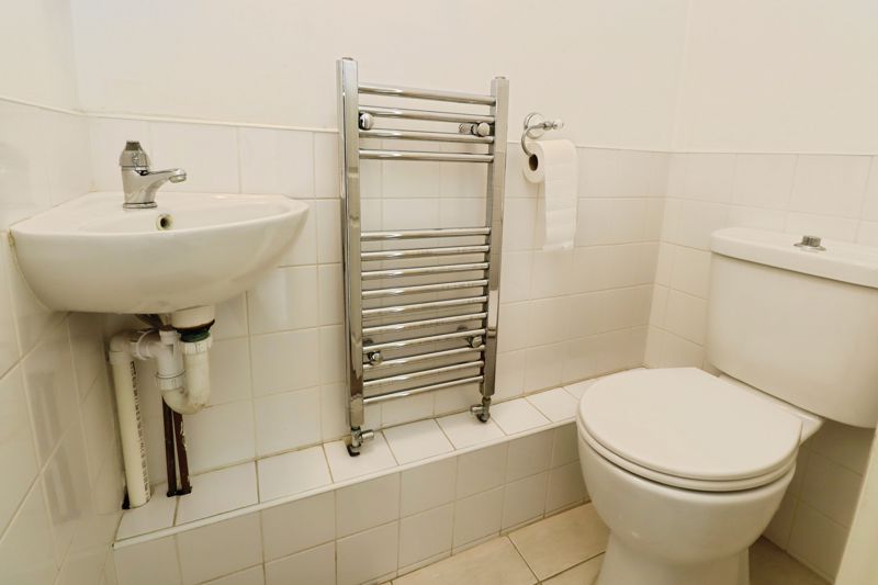 Tiled flooring, centre light. Low level WC and wall mounted hand basin, heated towel rail.