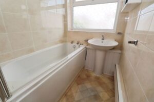 Obscured window to rear aspect, vinyl flooring, centre light. Panelled bath with electric shower over and pedestal wash hand basin. Finrad skirting radiators, fully tiled walls.